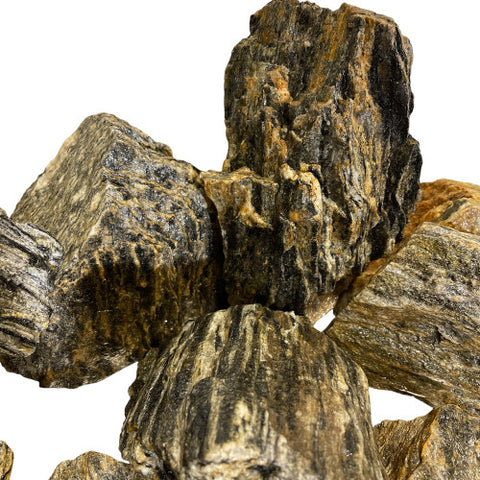 This magnificent stone is similar in size and shape to Petrified Wood, but with more grayscale tones and glittery dust. It has deep contrasts and sparkles in the light.