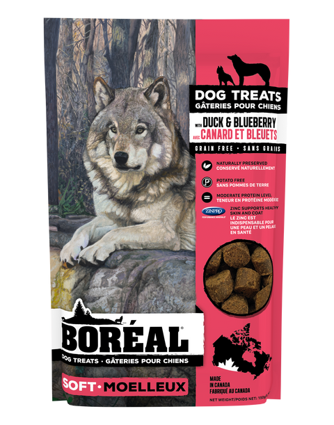 New BORÉAL Dog Treats are a tasty dog treat with added zinc to help skin and coat. Our very Canadian flavors are made using local salmon, duck and honey. BORÉAL pet food products are made of low glycemic index ingredients to improve your pet's health. Each treat contains up to 6.5 mg of zinc for good skin and coat with Availa®Zn organic zinc. Two treats per 35 lbs of body weight provide 13 mg of zinc. Based on buckwheat flour, our treats are grain free and gluten free. Buckwheat is not related to wheat, as it is not a grass; instead, buckwheat is related to sorrel, knotweed, and rhubarb.