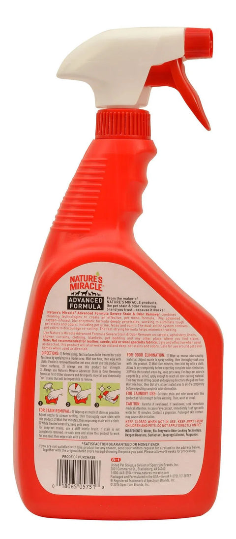 Nature's Miracle Advanced Stain and Odor Remover works to discourage re-soiling by removing the odor of dog messes. The bacteria-based formula produces enzymes when it comes in contact with boi-based messes including severe urine, diarrhea, vomit and blood, This product is safe to use on carpets, hard floors, furniture, fabrics and more, when used as directed, and leaves you with a light fresh scent.