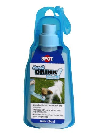 9 oz Mini Handi-Drink Instant Dog Drinker. Snap the bottle into water pan and squeeze. Provides fresh, clean water that your dog needs. Includes a 60″ carry strap belt clip and bottle. Comes in two colors – Seas Blue and Ice Blue.