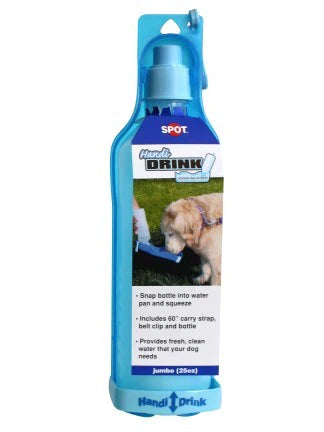 25 oz Jumbo Handi-Drink Instant Dog Drinker. Snap the bottle into water pan and squeeze. Provides fresh, clean water that your dog needs. Includes a 60″ carry strap belt clip and bottle. Comes in two colors – Sea Blue and Ice Blue.