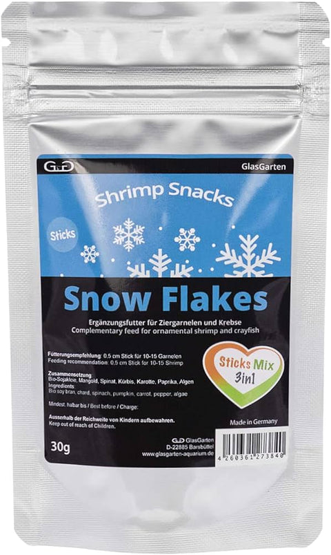 Once on the ground, the GlasGarten Snow Flakes - Sticks Mix 3in1 Sticks disintegrate relatively quickly, so that every shrimp / snail / crayfish (and especially the smaller young animals) can get something without stress. A multitude of positive ingredients make the Shrimp Snacks - Snow Flakes Sticks Mix 3in1 a valuable snack for your aquarium inhabitants.